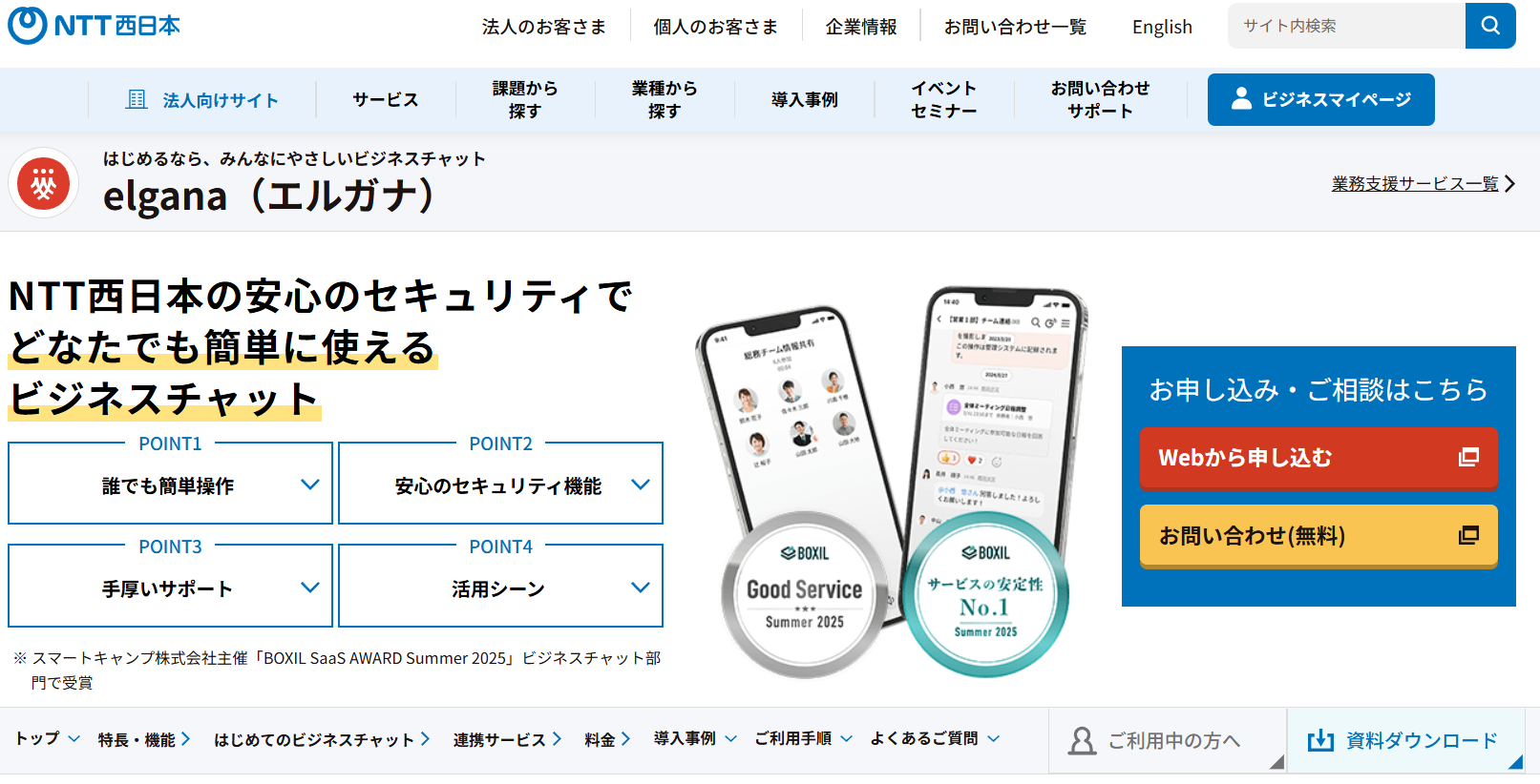 店舗の表側をデジタル化した後は、運営を支えるスタッフ間の裏側の連携が重要になります。NTTグループが提供するElganaは、日本のサービス業の現場に特化した高いセキュリティと使いやすさを備えたビジネスチャットです。